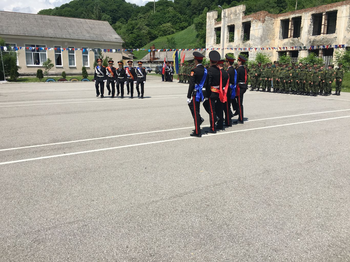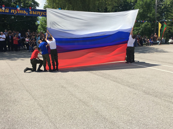 Фанфары. Гимн. Поднятие флага. Под четкую команду прапорщика Каширокова Х.Х. знаменная группа вносит флаг кадетской школы. Затем с напутственным словом к кадетам обращается директор школы полковник Эристаев А.М. :«Сегодня особенно волнительный день. За пятый год функционирования нашей школы вы- наш четвертый выпуск.